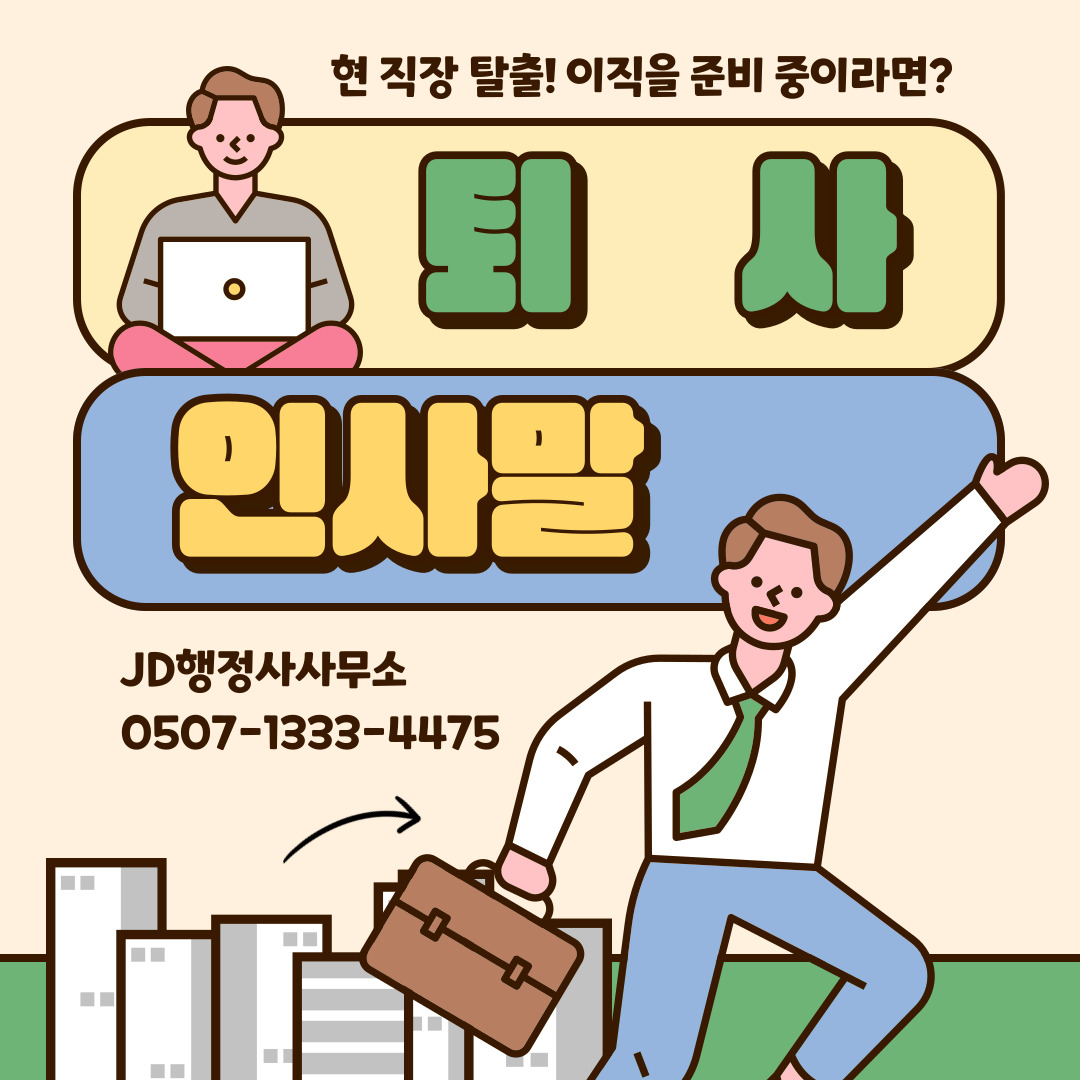 안녕하세요. 오늘은 퇴사 인사말에 대해 정리해 보았습니다. 오랜 시간 다닌 회사를 떠날 때 남기는 마지막 인사말은 단순한 형식이 아니라, 함께한 사람들에게 감사의 마음을 전하고 새로운 출발을 알리는 중요한 순간입니다. 퇴사 카톡 인사말, 퇴사 메일 인사문구, 마지막 문자 인사까지 상황별로 다양한 예시를 준비했습니다. 특히 부산·대구 행정사 JD는 많은 직장인 상담에서 “마지막 한마디”가 인간관계를 오래 이어가는 다리 역할을 한다는 점을 강조하고 있습니다.